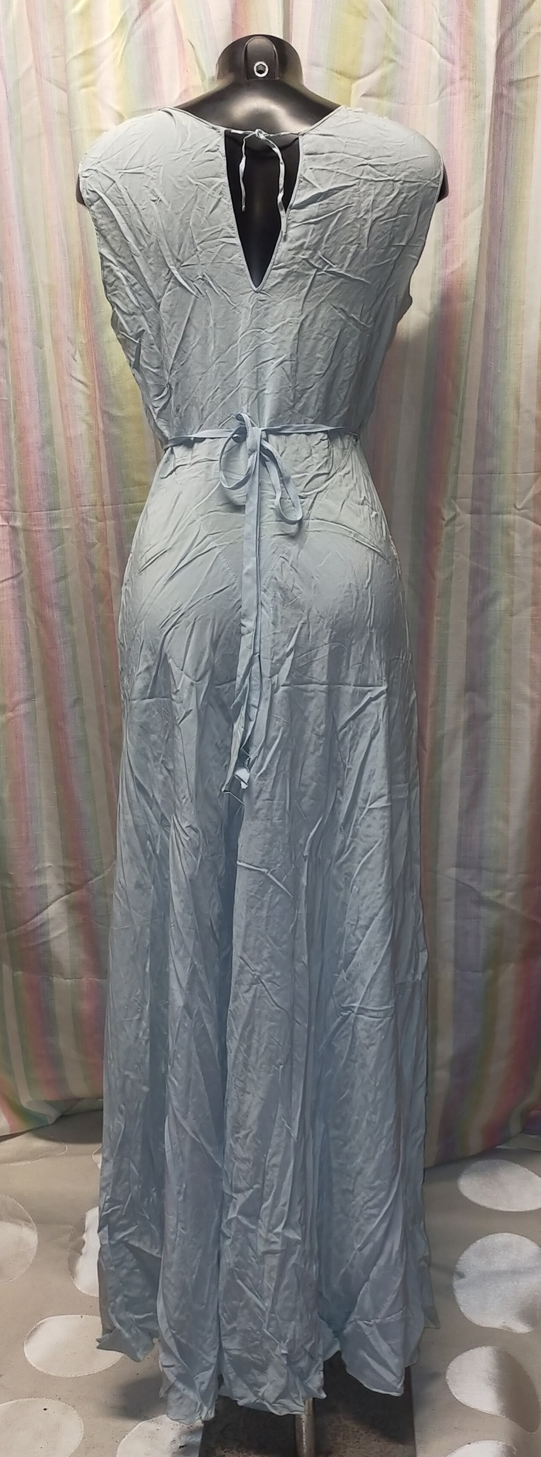 043 – Camicia da notte in seta azzurra percorsa dallo scollo all’orlo da inserti centrali e sulle tasche