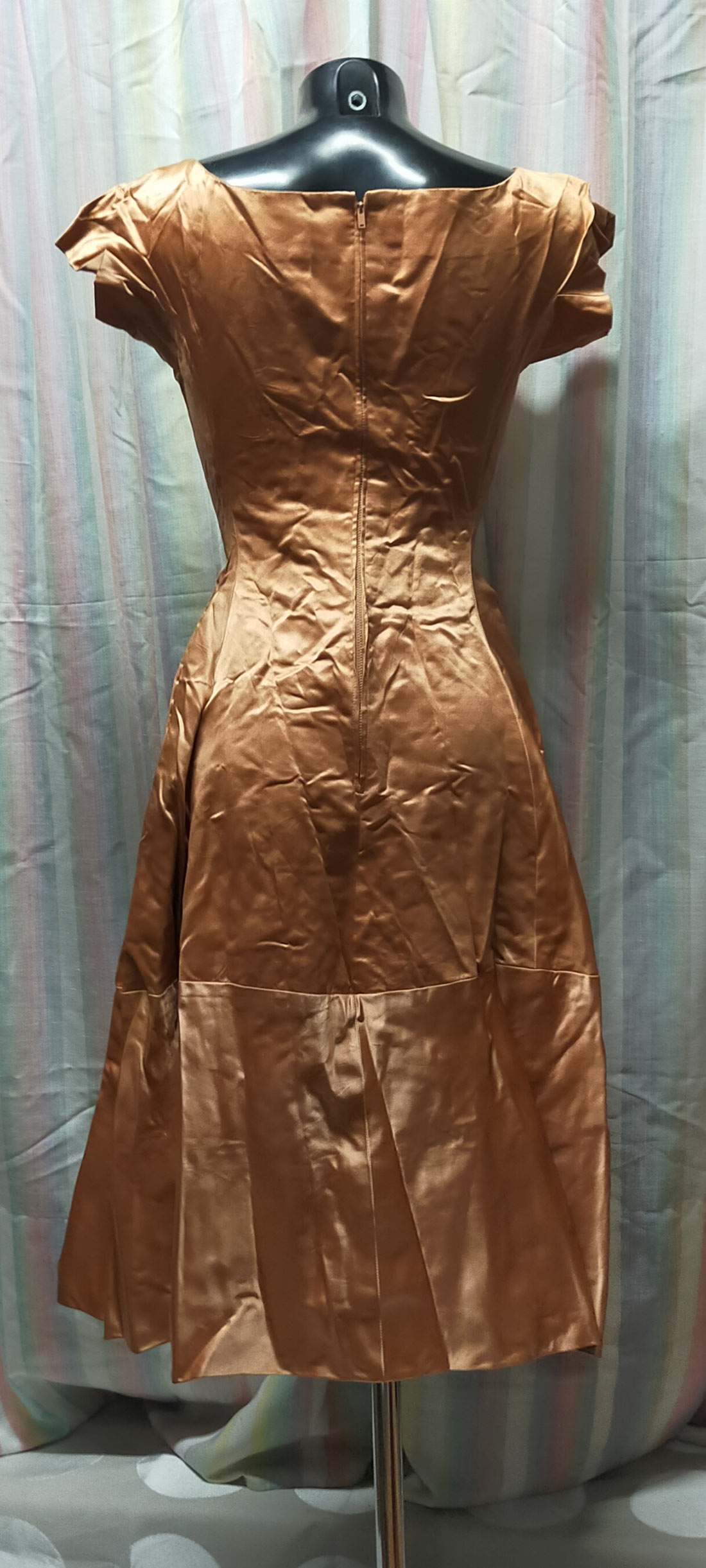 198 – Abito in raso giallo oro con fiocco intorno alla scollatura e motivo a pieghe sull’orlo